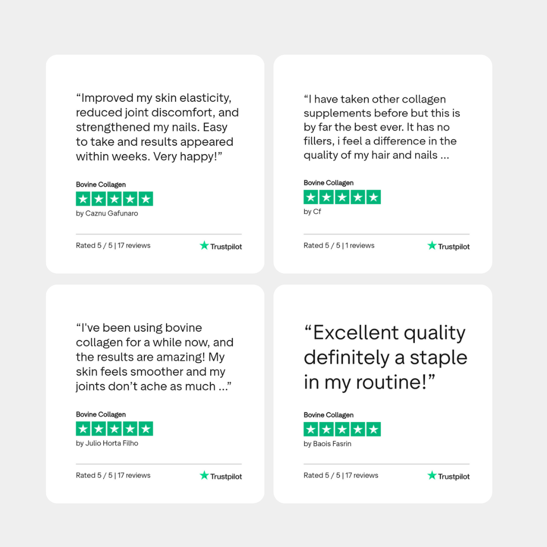 - Strengthens Hair and Nails Bovine collagen contains essential amino acids that are vital for hair and nail health. Supplementing with bovine collagen can help strengthen hair strands, reduce breakage, and promote hair growth. It can also support nail growth and prevent brittleness, leading to stronger, healthier nails.