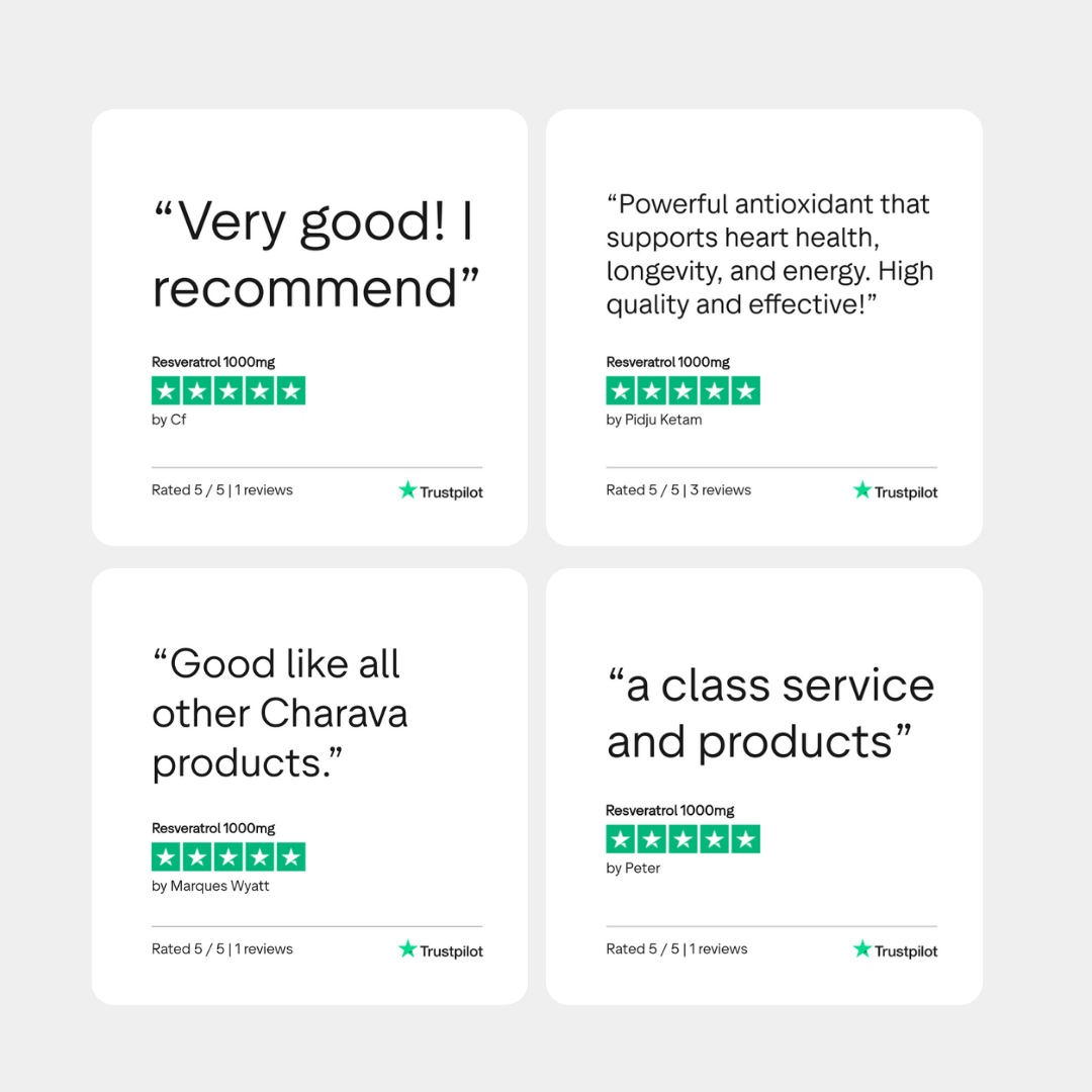 Charava’s high-strength 1000mg formula delivers 500mg of 99% pure trans-resveratrol per capsule, with 60 capsules per bottle, giving you a two-month supply of powerful antioxidant and anti-ageing support.
